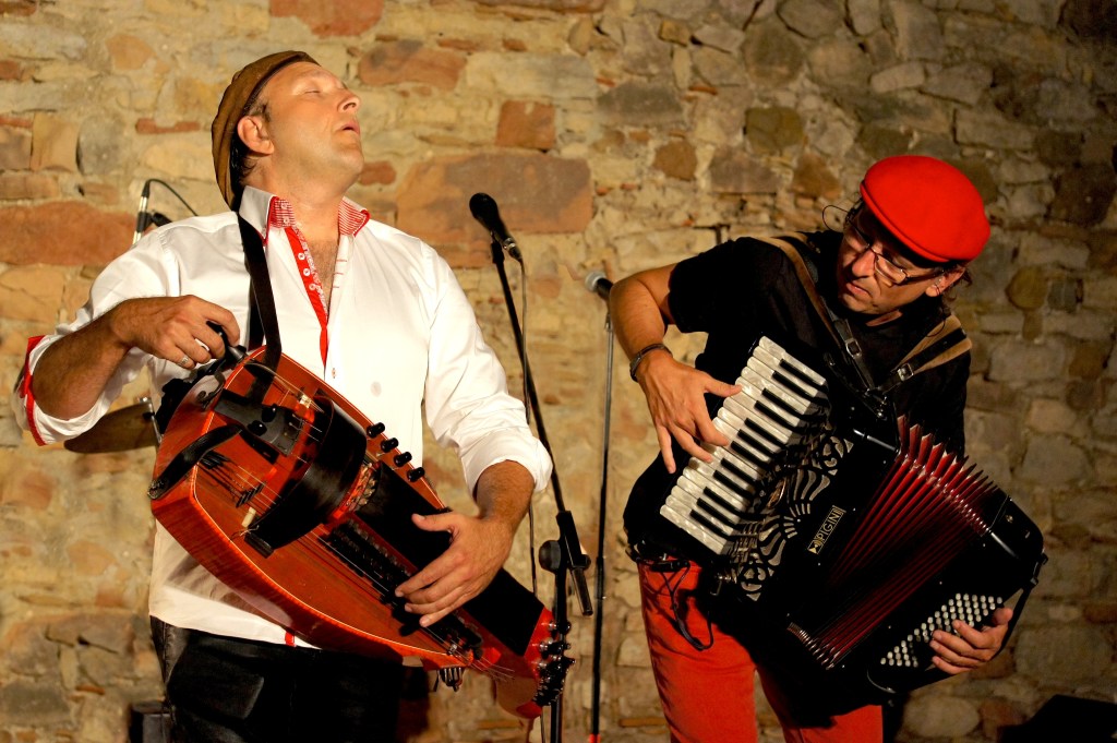 Duo de musicaïres biterrois puisant dans le répertoire traditionnel occitan. Vielle à roue, accordéon, chants et rythmes invitent à la danse dans le plus pur esprit du balèti populaire. Lo Castanha é lo Vinovel fan dançar lo monde !