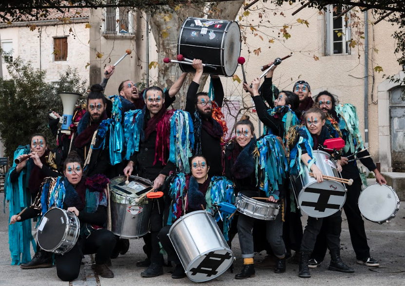 Percussif et polyphonique, leur répertoire s’entremêle de compositions originales, de chants populaires du Languedoc et d’ailleurs. L’ensemble pêchu s’accompagne de grallas, de cloches et de peaux tendues, et déambule dans les rues, les vignes, les cours d’écoles, dans une temporalité impalpable, un mouvement continu.